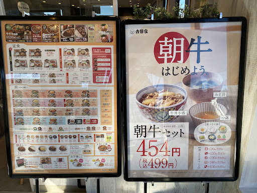 Read more何年振りだろう…吉野家でも入ってみるかと入り口メニュー特大から朝牛セット(¥499)でも頼むかと… 牛丼が小盛り😅 大盛り(¥209+)に変更。