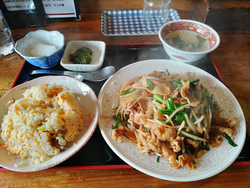 休日の12時前の訪問で店内は混みあっていて、座席は家族連れで満席。カウンター席が空いていたのでそちらに座らせていただきます。さっそくメニューをチェックしますが、連れはすでに冷やし中華を食べると宣言していたのでやや焦り気味に選択。定食セットは写真付きなので迷うところですが、迷ったときには一番最初に目に入ったもの、ということで豚肉とニラ炒めセット(930円)にします。セットは半チャーハンセットで+350円、半ラーメンセットが+350円に変更できるとのこと。いつもは絶対にしないのですが、半チャーハンセットに変更をお願いしてしまいます。ちょっと前にかなりおいしいチャーハンを食べたので「こちらのお店はどうかな?」という変な色気をだしてしまったしだい。まあいいか。