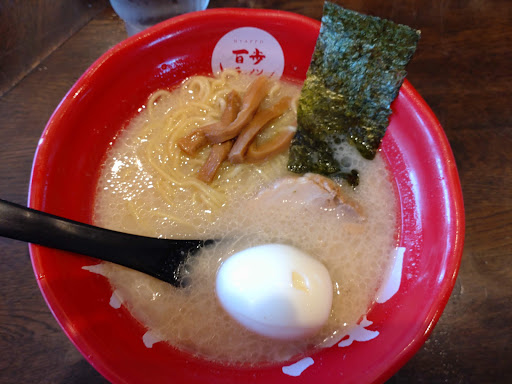 いつも昼時は行列が出来る戸田の人気店。平日の14時過ぎに前を通ったら駐車場が空いていて並びもなかったので久しぶりに伺いました。※駐車場は狭いので通りの車が落ち着いたら安全運転でバック駐車がおススメです 入店すると先客3名、全て配膳済で空いているカウンター席へ着席。飲み水と共に薬味として刻みネギ、辛子高菜が配膳。久しぶりという事もあり定番の百歩ラーメン(800円)+ゆで卵(50円)を注文し3分ほどで着丼。 ゆで卵は丸のままだと思ったら半分にカットされていました。湯気と共にニンニクの良い香り。スープ、麺とのバランスも変わらず良かったです。アツアツだったので薬味ネギを投入すると少し熱さが和らぎ食べやすい温度に。ネギは一気に大量に入れすぎると全体が温くなってしまうので注意が必要だと感じました。 チャーシューとネギを一緒に食べるとビールが欲しくなる旨さを感じながら吞みたい気持ちをグッと堪え、あっという間に完食しました。高菜は辛みが強いのでお子様や辛いのが苦手な方は少しずつ入れながら好みを探すと良いと思います。 並びがないタイミングが良い時にでもまた伺いたいと思い...
