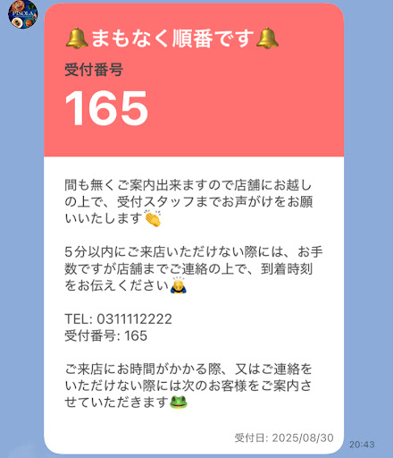 入店するのに当時予約する仕組みもわかりますしLINE通知がくるのはいいのですが、初めて来る方や歩き、バスなどのひとにその仕組みや待つ場所がないです。 残り3組、4組まできたので、どのくらいのペースかわからず、お店に向かいました。 基本車で来る前提なのか受付の方にお車でお待ちくださいといわれましたが、私は来店が車ではない為入口の待合室?みたいなとこにいましたが、エアコンがついておらず外でもなく空気も流れないので外気37度の中1時間またされました。 私以外に小さなお子様がいたご家族もいて、熱中症なども考えられる中、エアコンがあるのにつけないことに不満しかありません。 またうちにも子供がおり頭が痛いと言い出したので、エアコンついていますか?と受付の方に言いましたが、申し訳ございませんしかいわず、改善もしませんでした。 事前に電話、ネット予約の方優先はわかりますが、まだ来ても居ないのに席をとり13時すぎ段階で当時待ちは23組待ち...。 中のお客さんが何組も出てきているのに、私が残り1組まできても20分呼ばれなかったので聞きましたが、ご予約優先なので、まだ3組以上は待ちます。とそこでその仕組みをしりました。 受付の方が〇〇時ご予約の方いますか?まだきていないに叫んでいましたが、私たち以外居ませんでした。