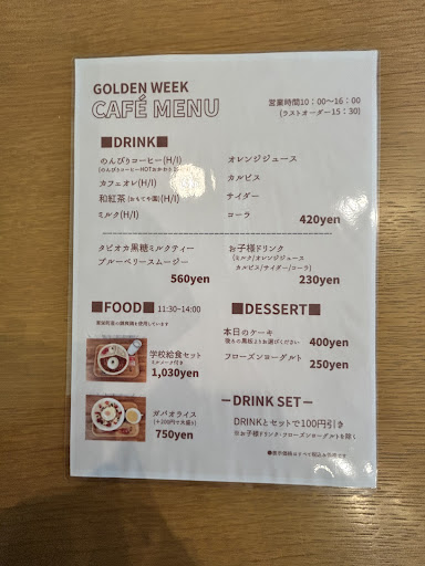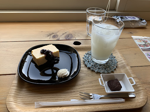 お店自体は閉校した小学校を使用しているらしくどこか懐かしい感じもある雰囲気があります。 小学校のグランドを眺めながらお茶をするという不思議な感覚はありますがそれもまた良し。 図書スペースも併設されておりカフェ利用者は飲みながら本も読めます。 カフェとしての最も大切な物はやはり飲食物の味。 メニューは給食セットのような小学校を使ってるならではの物もありますが今回私が頂いたのは和紅茶と本日のケーキのフォンダンショコラ。 和紅茶はポットサービスで出てきてティーバッグではありますが味はしっかり良く香りも柔らかで和紅茶の良さが出てました。 ただ、カップは小さく何度も注ぐ形になるので面倒かも? カップ自体を温める為に差し湯を入れた状態で来たので差し湯をポットに入れたあと少し置いた方が良いかも。 ケーキも物があれば5種類位から選べるのも嬉しくフォンダンショコラの濃厚さは紅茶と相性抜群でした。 また、店内には紅茶や緑茶のティーバッグや雑貨も販売されているのでティーバッグの方は気に入れば購入するのも有りかも。 雰囲気に全振りにならず落ち着ける優しい空間で静かにお茶するのには最適な感じ。 値段もドリンクとケーキで650円(ドリンク頼むと食べ物系が100円引きセットになる)と比較的安価でなおかつ美味しいのでここまで来る労力さえあれば非常にオススメ。 テラス席もあり施設自体にドックランもあるので犬飼いの方も寄れるかも。