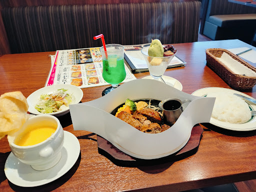 家族でランチを楽しみに初来店しました。まず、オーダーしてから配膳までの時間が長すぎる。男性スタッフがハンバーグを運んできてくれたけど何の説明も無し。食べすすめていたら次のハンバーグを運んできた女性スタッフが「当店のハンバーグの食べ方はご存知でしょうか?」と食べ方の紹介をしてくれた。男性スタッフ何も言わなかったぞ?ここで減点。食後のコーヒーを注文したがなかなか来なかったので、店員を呼びさきほどの男性スタッフ到着。コーヒーをお願いしたが20分たっても届かず、さらに減点。他の店員が「そろそろコーヒーをお持ちしましょうか」と声をかけてきた。さっき頼んだのに全然届きませんと伝えると「急いで持ってきます!」との返答。男性スタッフひとりのために2つ減点。さらに「伝票ください」と言わないと伝票すら届かない。客席数に対して店員が少なすぎるのか、食器が片付いてないテーブルも多くあった。若いスタッフが若干数でお仕事をされていてホール全体が人手不足なのがよくわかるレストランでした。子どもたちがパフェを食べたがったけど、またオーダーしてからも時間がかかりそうだったので諦めてスーパーでアイス買って帰りました。料理は、ハンバーグの下にもやしが焼かれてあったけど、明らかにもやしが真っ黒に焦げている。ひじきか?と思うくらい黒い。食べるともちろん苦い。食べない感じの付け合せか?そんなの聞いたことない。ハンバーグは美味しかったけど…。とに...