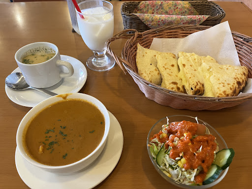 平日ランチメニューの「ランチのナンセット」1200円を注文しました。 カレーはチキンカレー、ナンはチーズナンを選択。サラダとスープ、ラッシーが付いて、ボリュームたっぷりでお腹いっぱいになりました。 カレーは2倍の辛さにしましたが、基本のカレーが甘口、というか甘味が付いているのか、甘さの中にピリッと刺激があるような感じでした。もう少し辛さを増すことを前提に甘めにしてあるのかなと思いました。あまりカレーで甘味を感じたことはないので不思議な感じでしたが、これはこれで美味しかったです。 サラダにはお決まりのオレンジ色のドレッシングがかかっていて、ザ・インドカレー屋さんのサラダといった感じ。大好きです😋 スープは豚骨ラーメンのスープみたいな味でした。 セットの方がお得かなと思ってランチセットにしましたが、すごくお腹いっぱいになったので、スープとラッシーは無しでいいかな。 次は単品で、食べたことない珍しいカレー...