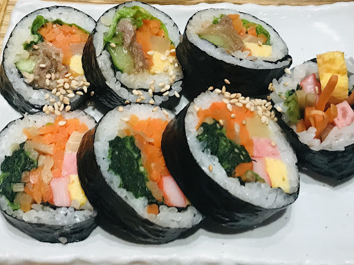 【ハーフ&ハーフのセット】¥1485 ★キンパ◯ ★海鮮チゲ◯ ★チヂミ✖️ ★小鉢(チャプチェ) 海鮮はサンプルとはかけ離れていたが、海老のコクは感じた。