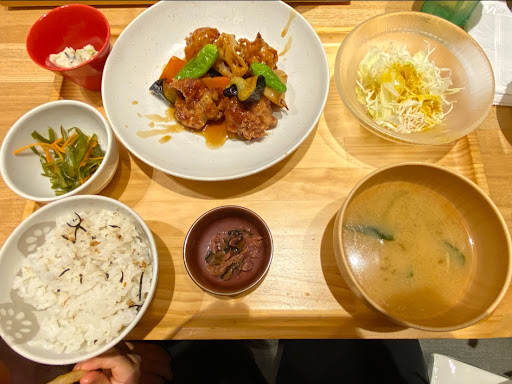 食感のある野菜や鶏肉を、ちょうどいい酸味の黒酢ソースと食べられておいしかったです! また副菜で野菜を摂れるのもうれしかったです。 なお、2種類のごはんと味噌...