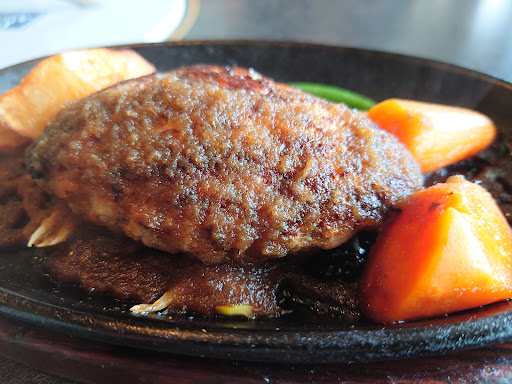 ハンバーグの断面から覗くちょっと大きめの半透明玉ねぎ。存在感があるのに肉の味を邪魔していない。外食だと玉ねぎの存在を排除したハンバーグが結構主流な中、ここまで玉ねぎの存在感があるハンバーグはうれしい。