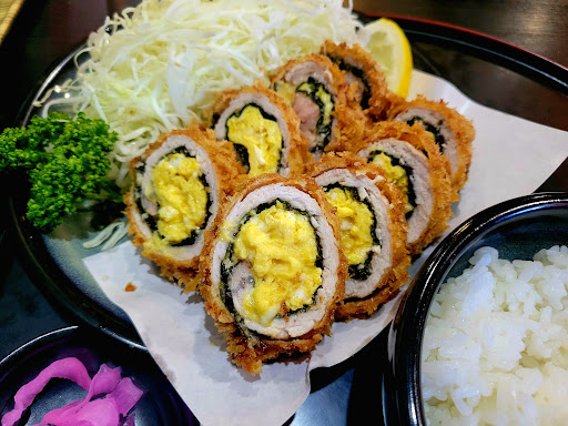 オムレツかつれつは、やわらか半熟オムレツが海苔ともち豚ロースに巻かれ、ザクザクの衣。