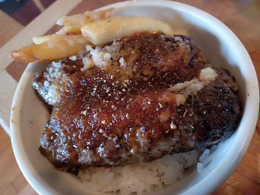 Read more愛知県を中心に展開しているハンバーグチェーンのブロンコビリー。本日は国道155号線にある東海店にて開店と同時に来店🍴 ブロンコビリーの良さは、俵型の粗挽きハンバーグ。店員さんがその場で半分にカットして提供。 おがわんこおすすめ👍のご紹介。 ①カットした後すぐに粉チーズをオン ②ご飯大盛りにハンバーグをオン③卓上にあるペッパーミルでペッパーをオン これでおがわんこ特製ハンバーグ丼が完成。 ブロンコビリーマニアのおがわんこ。東海店にはスーパー定員さんがいるのを発見。車椅子のお客様がいたが、なんと入店前から車椅子スペースを空けるため、椅子を撤去。なぜ分かるの大きさとか? ノールックで車椅子の大きさを? そして当たり前のようにお客様を誘導🙆アライバの連携プレーだ。 いやブロンコビリーだからテキサスブロンコ、テリー&ドリーファンクジュニアのザ・ファンクスだ🤪。そういえば、開店後も店長登場のあと○司さんがすぐに登場。 見事な連携プレーだ。この界隈には木曽路、ステーキ宮、しゃぶしゃぶゆず庵、ナンノカコーレ、最近できた浜木綿など外食乱立エリアの中、1番流行っているお店☀️ ブロンコビリー数多くの店舗を巡っていますが、サラダバーのお皿交換します?と言われたのは2店舗目です。お客様を良く見ているおもてな...