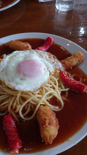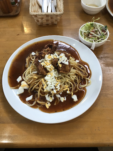 Read more東海市太田川の河沿いにあるあんかけスパゲティのお店です。知多方面から車で走ると…看板見にくいので〜少し判りにくいけど。お昼にスパゲティが食べたくなり…嫁さんと訪問しました。私自身1.7mmアルデンテが大好きなので…あんかけスパゲティは苦手としています。久々にあんかけにトライです。メニューはスパゲティメインですが…ピラフもあるみたい。夜と昼のメニューが異なり、お昼はあんかけ中心みたい。私はバイキング、嫁さんはペスカトーレを注文!ソースと麺の量を選ぶスタイル。バイキングは目玉焼きと赤ウインナー、魚フライがトッピングされています。 単品ですが…サラダも付きましたよ! ソースはミートとナポリが選べ、定番がミート。甘くて程よく濃くて優しいお味、胡椒辛いお店が多い中食べやすい!後味もスッキリでした。サイズはMにしましたが、若者ならLでも楽勝ですよ。パスタも太いながらも焼き感があり美味しかったなぁー!また行くと思います、オススメ...