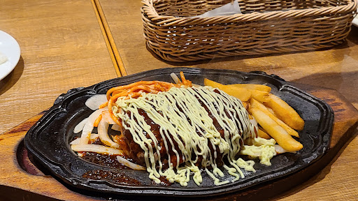 Read more金曜日の夕方6時過ぎに利用しました。駐車場は 結構 広めで、この時間は まだ ガラガラの状態。店内に入ると まだ 2組 ぐらいしか お客さんはいませんでした。外観からもわかるように 店内の雰囲気もカントリー風で、柱がなく天井 が高いので外から見るより広々とした空間でした。最初に案内された席がエアコンの風が直撃する席だったので、店員さんにお願いしたら 快く場所を変えてくれました。料理の方は黒毛和牛を使用した 超粗挽ハンバーグの わさびマヨネーズ 醤油を注文。Aセットをつけて牛すじ オニオンスープ とライス をチョイス。このスープがホントおいしかったー❗ハンバーグは 中は結構レアでフワフワでした。お肉 自体は あらびきである分 少し筋が 目立っていたので 、一緒に行った嫁さんは 中挽き の方が良かったかな?と言っていました。味は少し濃いめで、やっぱりライスが合うと思います。 ライスはおかわり自由なので たくさん食べられる人は とてもご飯が進むと思います 。メール会員になると、その場で ソフトドリンクが1杯無料になりました。店内で絞って作っているようで、フレッシュで美味しかったです。 マンゴージュースがおすすめです。誕生日を登録すると 誕生日月に使える20% 割引のクーポンがメールで届くそうです。(以前は30%) 支払いは paypay や 楽天ペイ など スマホ 決済も 利用できました。...