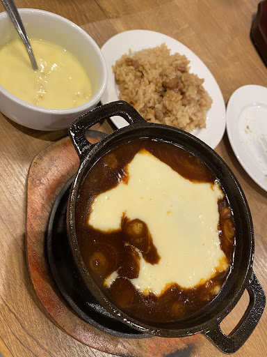 チーズたっぷりは、チーズ好きには堪りませんね。 しかしチーズとデミの味しかしないので、ハンバーグが勿体無い。 それを踏まえ、私は粗挽きハンバーグの中でも1番ソースが少ない(1番安い)物を食べました。