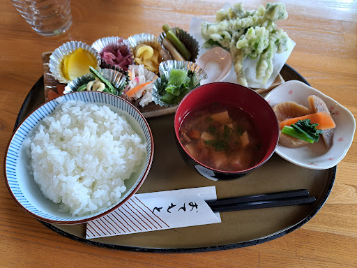 との事で、野菜や山菜のみを使った料理です。 日替わりなのか、他の方の口コミ写真を見ると内容がまちまちですが、伺った時の内容は、何れも野菜や山菜で、天ぷら、煮物、漬け物、ご飯(魚沼産コシヒカリ)、味噌汁(なめこ)といった内容で900円です。 どれも大変美味しく、あっという間に完食しました。
