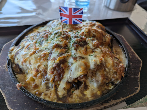 メニューを見て、とんかつとたっぷりチーズの焼きカレーに目がとまります。 とんかつ、パスタ、ライス、チーズ、ホワイトソース、カレーのコンビネーションだとか。 もうこれ、子供の好きが全部詰まってるやつですわ。 はい、即決。