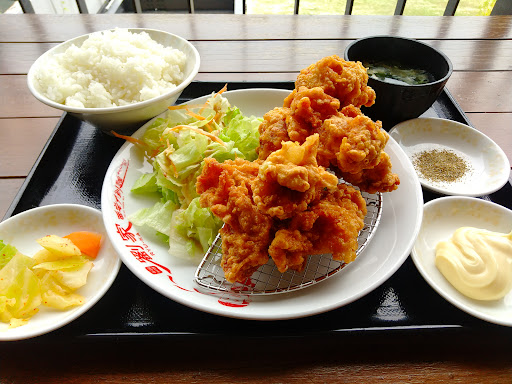 食べるのは初めてですが、以前から気になっていた「デカ盛り唐揚げ定食(1000円)をごはん大盛り(無料)で頂きました。名前の通りなかなかの盛りで、ごはんは小ぶりな丼で唐揚げは9個も乗っていました、味変用のマヨネーズとスパイスも付き、このスパイスがなかなか美味しかったです。気候も良かったので、テラス席に出て、山を眺めながら頂きました。