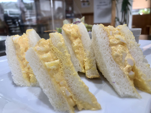 モーニングはBセットにアイスコーヒー。白い長方形の磁器の大皿にふんわり柔らかパンに沢山の潰し玉子の三角サンドイッチが4つが美味しい。レタス、水菜、人参、キュウリ、紫玉ねぎとコーンの様なドレッシングサラダもいい感じ。ミニカップは酸っぱいあんずの様なゼリーが付く。 アイスコーヒーは大きなワイン風グラスにたっぷりコーヒーアイスが入って、底は細かく上は大きな氷に白いポットに入った熱いコーヒーを注ぐ。苦味の濃いコーヒーは黒糖のシロップに良く合う深みのある味わいの本格的なコーヒー。 蓋付きのミルクも加えるとミルクのマイルドな風味に。 主人のマスターにポットの蓋を押さえるようにと言われ、来客にも大きく声かけを元気にしていて気遣いを怠らない。