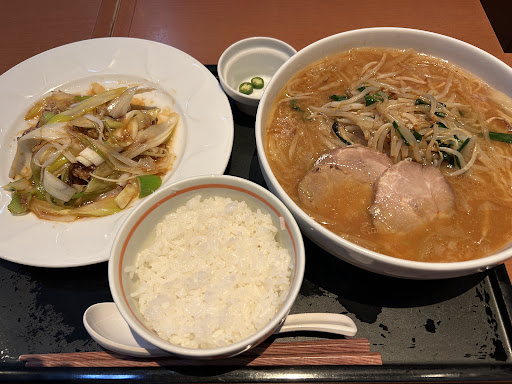◯味噌らぁ麺 〜五重の味噌 飯田店主おすすめセット ¥2,013 金山寺味噌のねぎみそ唐揚げ ~青唐辛子を添えて ライス