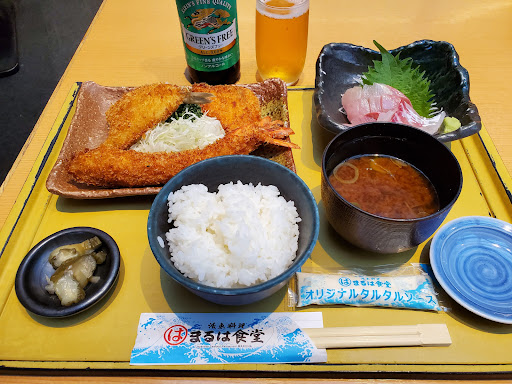 Read more大きなエビフライが凄く美味しいです。 時期で変わるのかわかりませんが、多少の大きさの違いはあります。 このお店の海蘊酢も新鮮で好きです。 今日のお米は、少し時間が経っていたのか硬めでした。(涙) お味噌汁にも海蘊が入っていて、健康的で嬉しいです。 「まるは食堂」は、皆に愛され続けて、創業 74年です。 私もこのお店が大好きで、15年以上のリピーターです。 「まるは食堂」の本店は、メニューも沢山あり、是非行ってみて欲しいです。 ⤵︎ ⤵︎