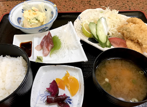 しかしながらここはアジフライ定食がいいと思った。 後から来たお客さん(隣に座られました)から、ここのアジフライはうまいぞ!と聞きました。 そして刺身定食を食べている間にアジフライ定食が到着。 なんとアジフライの横に刺身がついているではないか!
