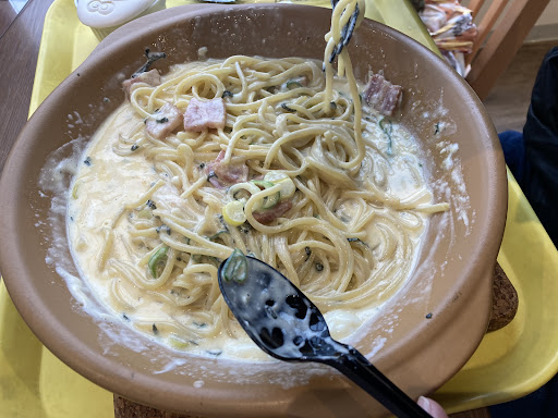その後 ベルがなり呼ばれると 先程と変わってないパスタと 新しくできたピザ。 ピザは至っていつもと同じが救い。 パスタはウォークで麺が全部 持ち上がるレベルでした。