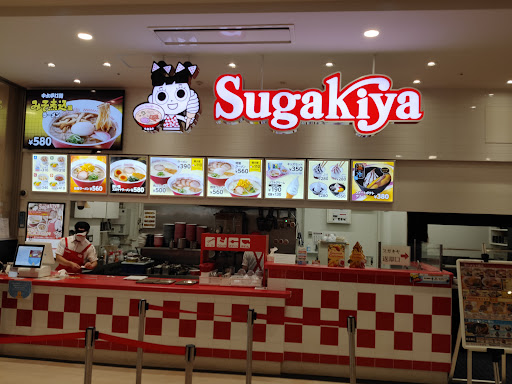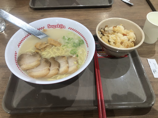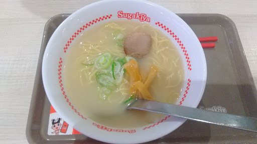 2023年11月 平日の午前11時過ぎ、飛行機の搭乗前の時間を利用してイオンモール常滑を散策中、二階のフードコートで偶然見掛けました。が、ちょっと子供向けの感じのお店のように思えて躊躇していると、同年配と思しき男性が来られて注文していたので、こちらも続いて人生初のSUGAKIYAデビューとなりました。 注文したのは「ラーメン」390円。支払いは電子マネーで。ベルを渡され待つこと数分、出来上がりです。 ラーメンは白濁スープにメンマ、ネギ、チャーシュー1枚が乗ったシンプルなもの。スープは豚骨ベースの塩ラーメンという感じでしょうか? 麺はやや黄色がかったほぼほぼストレート麺、固くもなく柔らかくもなく、良い加減です。スープは若干塩気が強い感じでしょうか。しかしこれで390円(税込)とは凄い。今時この価格でこのクオリティならとても頑張っておられると思い...