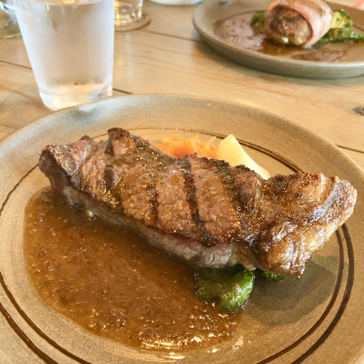 ◯知多牛ランプステーキ🥩 ハーフポンドの255gなのでやはり迫力がかなりあります😲ランプ肉と言えど、国産の銘柄牛255gがこのお値段なのは中々にコスパ良いなと感じます🥹 和牛らしい厚さの割に柔らさがあります😳 ただ、和牛にしては、しっかりした食べ応えがある硬さもあり、あまり脂肪が多くないのでさっぱり食べられる感じです😋 ステーキは恐らくバターも纏っており、和牛でありながら、アメリカンステーキな雰囲気もあります🧈 ソースは標準的な和風ソース✨ 付け合わせはしっかりグリルされたブロッコリー・カリフラワー・ししとう⁈とキャロットラペ🥦🫑🥕 付け合わせの野菜は臭みもなく美味しいです😋 キャロットラペは恐らくクミンが効いていて本格的でややカレー風味のスパイスが効いてました👨🍳