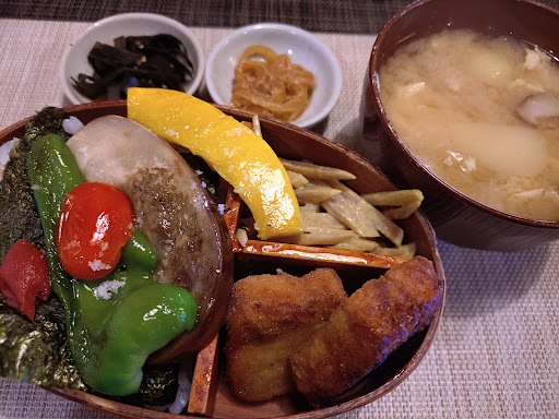 Read moreSNSでチラチラ見かけるわっぱ弁当 が気になって食べに行ってきました。 渋滞する交差点手前の駐車場に停めたけど遠すぎたかな??と反省しながら歩いていたらお店に到着。ってか、目の前が広めの駐車場だったし(笑) 道は細めで歩行者多めだから注意必要だけど目の前。。 こじんまりとした可愛らしいお店。 雰囲気良さそうな感じが店内に入る前からする!! あっ!珍しいお野菜が売ってる。 見てるだけでも楽しいけど、、今回の目的はわっぱ弁当なので店内へ あっ!外観から想像した通り雰囲気いぃ〜お店。 メニューはシンプルで、お弁当はのり弁当のみ。 テイクアウト可能だけどイートインでゆっくりランチ。 お味噌汁はキノコ出汁を注文し待つこと約10分 おぉーー♡写真でみるまんまのわっぱ弁当だ( ˆoˆ...