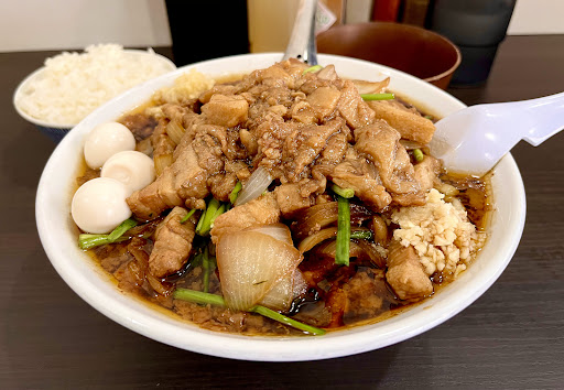 ・味 先ずは麺をズルリ。 おお!ワシっとしたややちぢれの中太麺!小麦の香りしっかりで予想外にウマイ! スープはもっとどぎつい味と思いきやコク深い醤油。完全に具を引き立たせる味付け。 そしてお待ちかねの具!拍子木切りされた豚バラ、大きめカットの玉ねぎ、ニラをパクり! おおお!コレコレ!こちらももっとギトギトな感じかと思いきや肉の旨味とカエシ、甘めの味付け、玉ねぎの甘みが複雑に絡み合ってウンマ!ああ〜コレはコメ泥棒なヤツですわ。 この具を我慢出来ずにオンザライス!ややカタメの米と具の旨味が渾然一体となってウンマ! 次に生玉子でスキヤキ、、、あ〃〜甘辛なタレと玉子、正にスキヤキ! 日本人のDNAに「ウ・マ・イ」と刻まれたヤツ! 卓上の山椒、一味をドバドバっと振りかける。 コレも美味しい!優しめスープはこのカスタム前提かと思う程! 麺はあっという間に終わるので穴あきレンゲで具を掬ってご飯で食べて、、、むむ?意外と小ライスボリュームあるな、、、小さめ椀にみっちり詰めてくれてる!最後は余った玉子をかけて卵かけ御飯で締め!美味しかった!ご馳走様でした!マジで再訪レベルですわ、、、