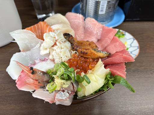 きましたー海鮮丼!これでれ1880円? まじですか?本当に? なんと素晴らしい! マグロは中トロもトロトロお口の中で とろける、赤身も臭みなく美味しい ホタテは大粒でぷりぷり!白身魚や鯵、 脂ののったサーモンにふあふあの穴子まで! ウニは臭いが気になったけど でも!!大満足のランチとなりました。 残念だったのが酢飯でお願いしたのに 酢飯じゃなかったこと、一応確認したら 盛り手のおばちゃんが酢飯だと答え、 大将がうすかったですか?と💦 なんと残念な返事 絶対に酢飯じゃないのになー