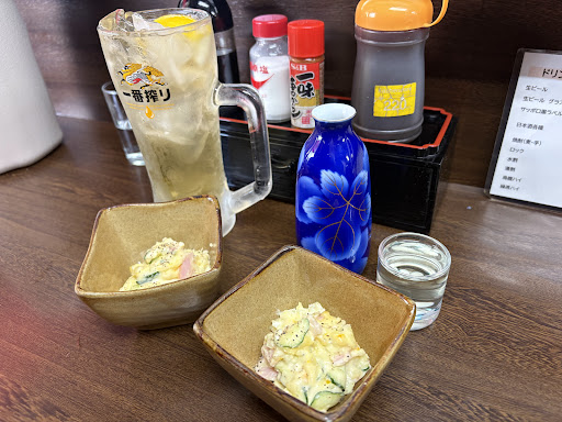 アルコール類も豊富で自分は日本酒、奥さんは角ハイボールをお願い。 するとお通しで美味しいポテサラが付いてくるのが嬉しい。