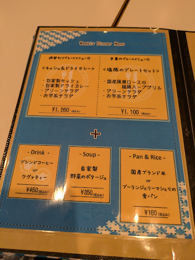 メニューは週替りだそうで、キッシュとドライカレーのセットに、別料金で塩豚をのせていただきました。 デザート、ドリンクも別料金です。