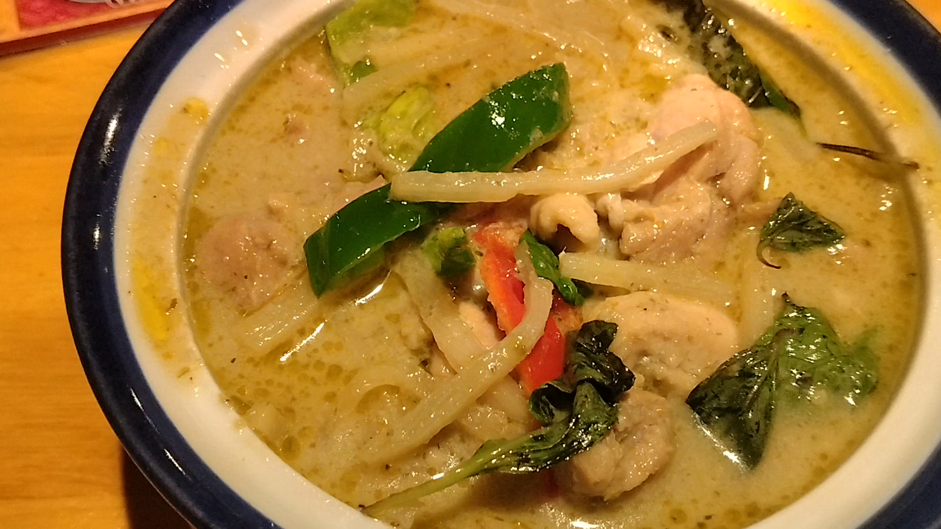 最後に来た恐妻のカレー。 筍の細切りがびっしりと入ってる。 一口もらって食べてみた。 んーん・・・・。 ココナツの味がきついのか、なんとも複雑なカレー。 これでタイ米の完食は無理だべ。