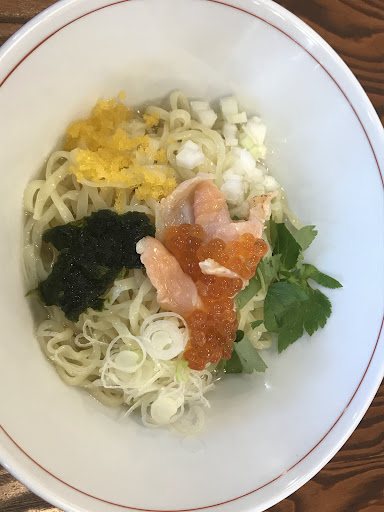 本日は評判の良い、サーモンとイクラの山葵和えそばを注文。 今まで『すみれ』『純連』等の北海道味噌ラーメンを好んで食してきた自分には良い意味で衝撃的な逸品! 麺は手もみのピロピロのやや平打ちタイプ?と、なかなかいい感じ。 それよりも何よりも『和え麺』なので底に溜まっている旨みがギュッ凝縮された『タレ』を、まんべんなく混ぜ合わせて食すわけですがコレが絶品過ぎます! この逸品はまさに唯一無二と言われる名作です! 麺が食べ終わる前におかかご飯が出されて器に残った汁と具材を混ぜ合わせて茶漬けの様に最後に締める食べ方も衝撃的ですね。 夏場に訪問したら、いつもの締めの『おかかご飯』になんと!『オクラ』がプラスされていました!いつにも増してのウマウマ〜!最高ですわ〜(笑) 値段据え置きでコレをされていると言う事は顧客満足度を高める為の一貫でなされているのでしょうか? だとすればきくやファンとしては、こんな嬉しい事は無いですね!😀 素晴らしいと思います! これほど独創的に加えて繊細な味わいで美味しい、この品はインパクト絶大!ますます大好きになっちゃいます!