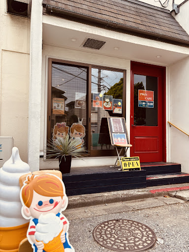 ポップなソフトクリーム🍦マークが目印のツインカフェは、人通りの多い通りから少し住宅外に入った場所にあります。