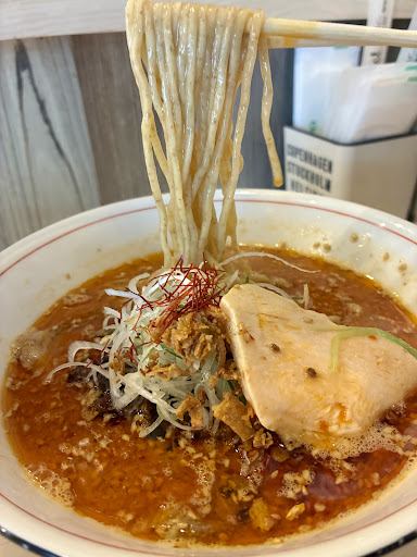 供された担々麺は、 見るからにクオリティ高い! 麺もしっかりコシがあり、 白髪ネギに青菜や野菜もたっぷりで、 濃厚なスープの上澄みはしっかり辣油を感じます。 結構なピリ辛! 思いっきり啜ると咽せるので、 しっかり大人の担々麺です☆彡