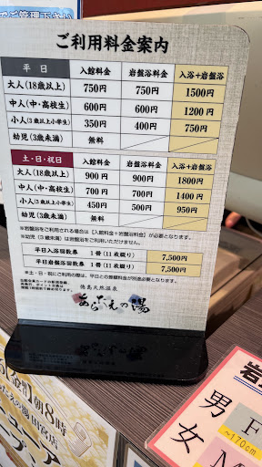 ・土日祝 入館料/岩盤浴料 大人(18歳以上)900円/900円 中人(中高生)700円/700円 小人(3歳〜小学生)450円/500円 幼児(3歳未満)無料