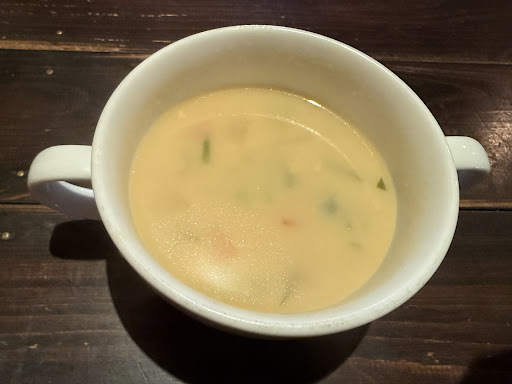 そして供された、 優しいクリームスープにミニサラダ。