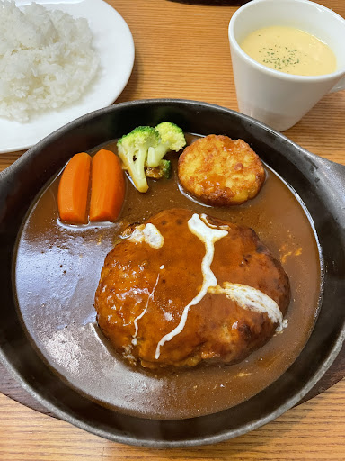 Read more土曜日の夜に利用しました。 ・和風ハンバーグAセット ・煮込みハンバーグCセット を注文しました。みなさんが書いてるようにハンバーグはかなり柔らかいです。つなぎ多め?、、お肉の味がまったくしなかったのが残念です。究極のハンバーグと書かれていたので勝手にハードルがあがっていたのかもしれません。柔らかめ(ミスターバーグみたいなハンバーグ)が好きな人は合うかもしれません。和風ハンバーグの隣の目玉焼きは火が通りすぎてて箸で切れないほどでした。半熟をハンバーグに絡めて味変したかったのでこれも残念です。大根おろしもでかい大根が1つまぎれてました。つけあわせの人参、ハッシュポテト、ブロッコリーは普通でした。セットにしたサラダのドレッシングがどこかで食べたことのある青じそドレッシングでこれもこだわりがないように感じました。ポタージュは美味しかったです。スプーンがなかったのであれば嬉しかったです。煮込みハンバーグのデミソースは個人的に好きな味でした。ごはんの量は150グラム程で少なめでした。