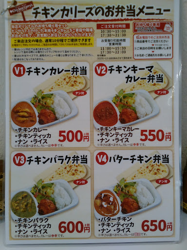 メニューは4種類だけで外税価格。 チキンカレー500円 チキンキーマカレー600円 チキンマサラ700円 バターチキン800円