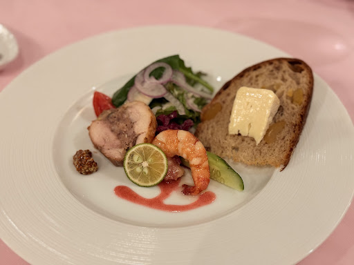 この日、Aランチのメンイのお肉料理は豚肉で、魚料理はスズキとのこと、私は肉料理を選びましたが、ちょっと脂が苦手で脂の部分を結構残してしまいましたが他はすごく美味しかったです。 前菜の盛合せ、スープ、サラダ、パン、メンイ(肉料理又は魚料理)、デザートの盛合せ、ドリンクが順番にコースで出して頂けてゆっくり食事を楽しむ事ができました。