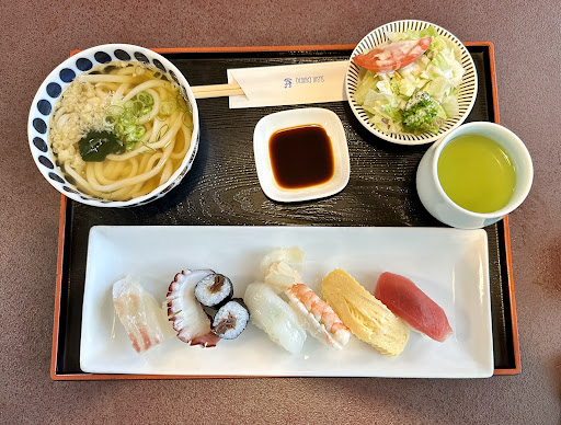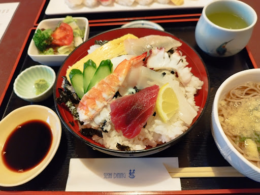 Read more初めて行きました 今日のサービスランチ(海老天丼)が660円ととにかく安い!そして天ぷらも、さっくさくで美味しいです。お汁は出汁は思ったよりあっさりめでした。でもあつあつで満足感がありました。サラダは玉ねぎシャキシャキ、新鮮でした。お寿司定食は蕎麦のお出汁がよくきいてて美味しかったです。お寿司は たこが肉厚で、どのネタも新鮮です。 シャリとネタの温度がちょうど良くて、冷た過ぎないので口の中でマッチします。シャリはふんわりと握られていてとても食べやすいし美味しいです。見た目はざわざわしていますが、清潔感があって落ち着く空間でした。何より、大将の奥さんらしき店員さんの接客がとても愛嬌があって素敵で、素晴らしかったです。親切で思いやりがありました。 座敷もあって、子供椅子もあったりトイレには子供用の取り付け便座もあり、家族連れにもおすすめです。亀と金魚も住んでました。 また行きたいと思え...