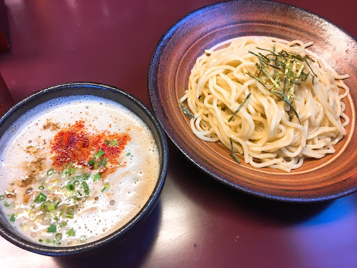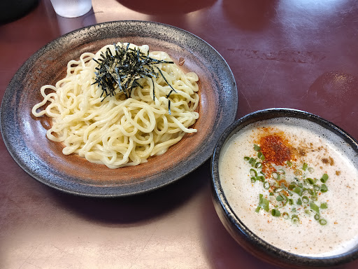 券売機でつけ麺並と肉を購入したが、券売機前が大混雑していて写真撮れず値段忘れる。カウンター8席と4人掛けテーブルが2つだが満席。つけ麺は茹でるのに時間がかかるので、覚悟して席が空くまでのんびり待つ。ゴゴゴと突然の音に驚くが、ミキサーでスープを撹拌していると気づくとどんな味か大変楽しみになった。物静かでクール系の店員さんが一人でくるくると席への案内や配膳や片付けを頑張っている。ありがとうございましたと店員の声は小さく聞こえるが、カウンター向こうの店主は声かけは無し。口コミで愛想が悪い感想が少しあったが、どうもそうではないように感じる。料理に真剣に向かい合っていて気がつかないか、いっぱいいっぱいなのではないかという感じがした。そのかわりカウンター上の謎の置物が大きな口内にありがとうと書いていて微笑ましかった。さてようやく自分の番になったが空いたテーブルへの案内はない。不思議に思ったが一人だったのでカウンターがお好みかもと思っているのかもと、自分からここいいですか?とテーブルを指差すと、少し控えめな微笑と共に「どうぞー」と声かけしてくれた。つんつんしたり無愛想ではない様子なのでひと安心。自分の前に7人待ちの為作成は25分超えだったが、タブレットで読書して難無く待つ。商品が来た時「お待たせしました。熱いのでお気をつけ下さい」と聞こえるぎりぎりの小さい声で囁いていく。学生さんだらけで騒がしい店内だが、流れる音楽は上品だし本来は静かな店なのかもしれないと感じた。あまり太くない麺は程よく茹で上げられのど越し良く食べやすい。つけ汁はクリーミーで鰹節や魚粉などの舌触りに邪魔なものは全く見えず、先程のミキサーのおかげかと納得。飲みやすく軽く爽やかなつけ汁に麺をくぐらせて啜るとああ美味しいなあと嬉しくなる。汁に何枚も少し厚めの豚バラ肉が入っていてとても食べ応えがある。こんなに入っていると知らずに注文した別添えの肉は濃いめの味が付いていてまた別物のようで、合間に頬張るとまた味わいが変わる。愉しんで食べていたがあっという間に完食。続々とお客が来店し玄関辺りで待っているので早々に席を立ったが、ごちそうさま!と大きな声で言うと、店主は少し驚き戸惑ったように「。。。ありがとうございました」と囁くような声で返ってきた。きっと店主は無口だったり恥ずかしがりだったり照れ屋だったりするのかもしれないなと思いながら、旨いは正義だと満足して店を出た。大変ごちそう...