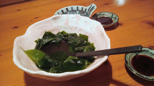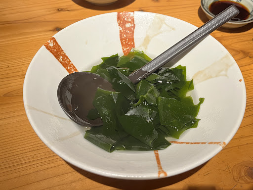 ■お通し 出汁で湯通ししたワカメだったんですが プリプリでめちゃめちゃ美味しかった♡ ポン酢も一緒に出てきますが 出汁に入ってるんで そのままでも十分美味しい! 鳴門ワカメなんかな、これはハマる。