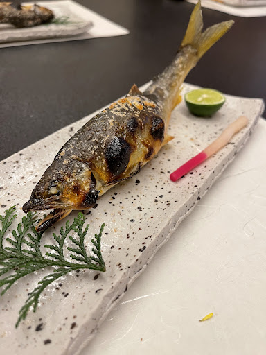 この日の個人的な一番はやっぱり「鮎の塩焼き」 観光地などで食べる鮎の塩焼きと違い、料理人が丁寧に火入れした物だから、美味さが段違い。 ほくほくジューシーな身質に、川魚独特の淡白な旨味。 肝のくどくない苦みが旨味にアクセントを与える。 意識を向けると感じられるスイカのような余韻の甘みがまた美味い。 天然の鮎って、なんでこんなに美味いんだろう笑? 美味すぎて追加しちゃった。