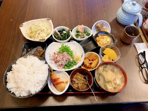 約2年前にオモウマ紹介の超地元密着型の定食屋さんで夜は居酒屋風で完全予約制鉄板料理なども提供😌🍺🧋 予約無しで開店時間に伺うと予約しているお客さんが先に4人居て席は空いているけど後回しになるけど良いですか?と聞かれて大丈夫と返答🙆OK 予約客最優先で何人かお昼前に来たフリーの方々は基本的にお断りしていました🫣😢 男性1人の方もお断りとの記載もありましたけど常連さんは大丈夫で一見さんはかなりハードル高く自分達は開店前に行きたまたま予約客が少なかったので入れました😜😉 ただし予約との客は12時半頃になっても現れず予約が本当に完了しているのかお互いに曖昧みたいでこんな客を優先的に待っていてもどうしようも無いのになぁと昨今のいい加減な予約客によってわざわざ遠方からの一見さんは可哀想だしいくら常連優先と言ってもやりすぎ酷いと思いましたが小さな自分の店だから仕方ないか🙂‍↕️😩 ランチでの提供はおそらく10食前後で来店を検討の方は予約するのがマストかなぁ😌 ABの定食を一つずつ注文してから20分で提供 段取り悪く注文入ってから作っているので時間には余裕を持って下さい😊 運ばれてきた定食は豪華絢爛凄いボリュームに圧倒されます😂🥰 小鉢ギチギチこれでもかと10種類以上の見ただけで食欲湧いて来ますね😇 一つ一つが愛情たっぷり非常に美味しくメインのゴマがまぶされた刺身は珍しく角煮は柔らかくてプルプル本当に美味い😍🤤 看板や店内の雰囲気も手作り感満載で全部和子ママさん自前らしいです🤩🥹 非常に気遣いある接客でもてなして頂き有難うございました♪次回は予...