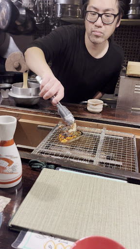 店員さんがじっくりと焼いてくれます。 すこーし醤油をたらしていただきます☺︎
