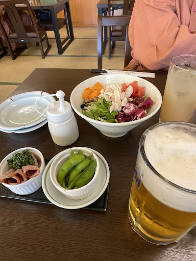 豊島園庭の湯内のレストランです。 畳に低めのテーブルと椅子の陽が差し込む明るいコーナーと少し照明を落としたテーブル席コーナーがあります。 メニューは蕎麦 海鮮丼 カツ 天ぷら ラーメン ビビンバ 板わさからサラダ カレーと種類豊富です もちろん一杯飲めます。