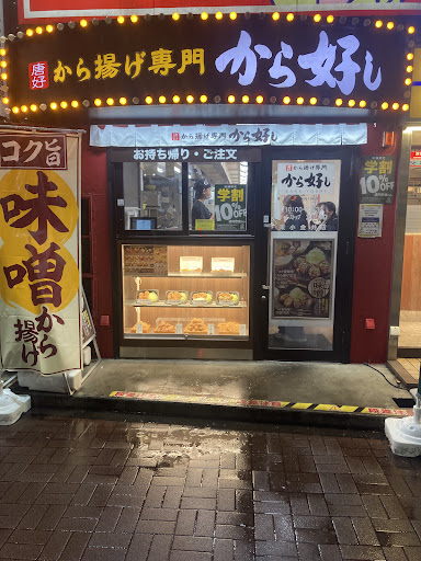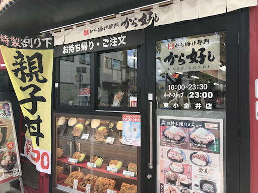 4/14〜業態変更で「から好し」へ。〜オープン記念、期間限定「から好し定食4個」選択。ご飯大盛り可能なのでもちろん大盛り。熱々唐揚げはジューシーで旨い、ニンニクダレとレモン添え。安定の割干し大根。持ち帰りには行列、Tポイントも加算出来ます。