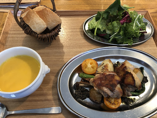 気になってたお店がランチやってて…フランス料理とナチュラルワインさんぱち食堂さん。 開業以来評判高いお店に初訪問。 ①食前酒オペレーターは白ワイン+ジンジャーエール 本日のランチから ②ラム肉のハンバーグトマトソース サラダスープハーブご飯付 本日のスープは大根のポタージュでご飯のハーブはローズマリー。 しっかり身の詰ったハンパーグとたっぷりのグリル野菜に濃いトマトペースト状のソースでローズマリーのご飯が足りなかったですね。