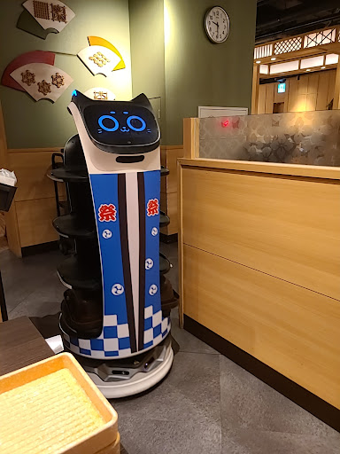 店内には配膳(配達)ロボットが動いているが正直かなり効率が悪い 2皿程度をロボットが配達でも効率の悪さだが卓の客がいないと取ってください系警告音楽が鳴り響く それを聞いたスタッフが卓まで行きスタッフが下ろす あまりにも無駄すぎる