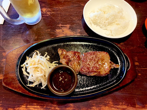 Read moreランチで300gのステーキをオーダー。 「スープとお水はセルフになります」 とバイト?さん… ステーキとライスが運ばれるまで お水をひとくちして、熱々のスープを飲みます。 腹に染みます。すでに幸せ… いよいよステーキとライスが運ばれます。 ライスは普通盛り… 大食漢の私はすぐにセルフお代わりです。 それと一緒にスープから味噌汁に セルフチェンジです。 肝心のステーキも美味しいです。 ここで誤解を招くといけないので、 詳しく語りますが… 税込¥2000で300gのステーキを食べ、 お釣りを貰う事実です。 コスパを考えるとステーキの質にも納得! お店の企業努力に頭が下がります。 次のお代わりは、ゆかりご飯です。 腹一杯。堪能しました。 お店の人達も周りに注意を払いつつ 背中で接客している感じ… 変な視線を感じる事無く、ひとりで食事していても快適です。 言い忘れたのはステーキソースも数種類から選べます。 ガリマヨがお気に入りで、 思わずレジでお代わり値段を聞いちゃいました笑。 携帯を使ったポイント付与で、たまにお得なサービスも受けられます。 次回¥600サービスとの事… 長居は迷惑。サクッとお得にステーキを楽しめる、うれしいお店です。 家族でOK!...